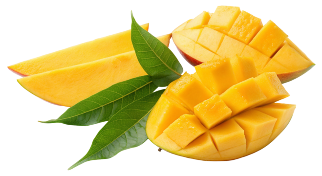 Fresh ripe mango slices with green leaves on white background for healthy tropical fruit concepts