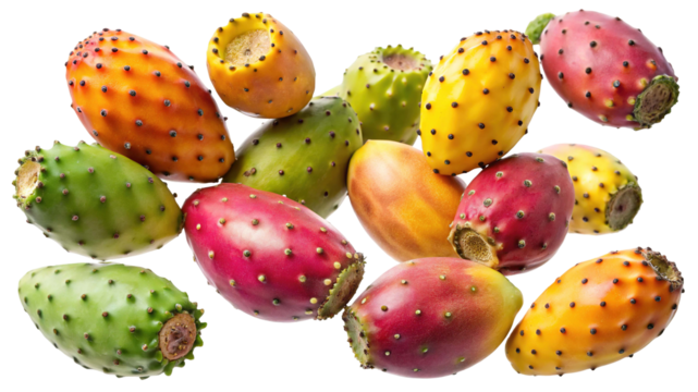 A vibrant collection of ripe prickly pear cactus fruits in various colors and stages of ripeness isolated on transparent background