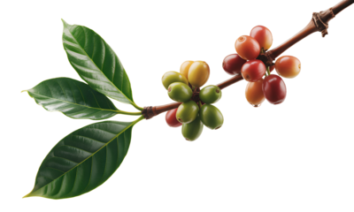 Coffee beans on branch, green, red, yellow, ripening process, agriculture, plant, leaves, coffee plant, coffee cherries, coffee fruit, beverage, caffeine, drink,