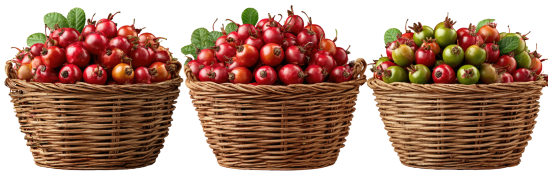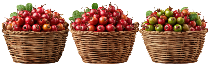 Baskets of hawthorn berries, ripening red to green