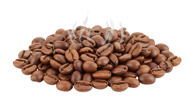 Pile of roasted coffee beans, steam rising from the top brown, isolated on white or transparent background, AI