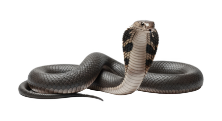 Detailed close-up of a coiled cobra snake with hood expanded on white background, perfect for wildlife and nature projects
