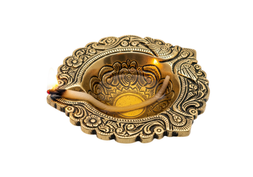 Ornate brass diya oil lamp illuminating diwali festival celebration and hindu spirituality with a burning flame on transparent background