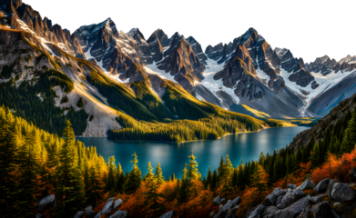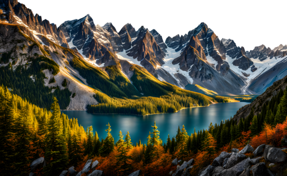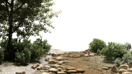 Peaceful mountain landscape with a river flowing through a dense forest, isolated on transparent cutout background