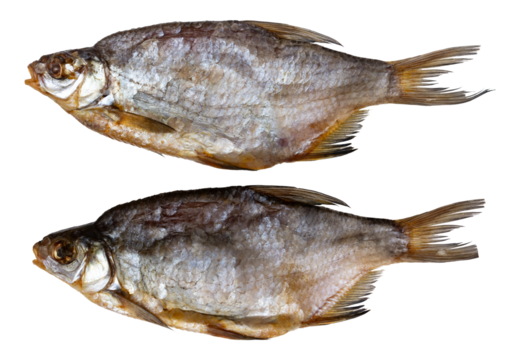 A photo of dried roach fish isolated on a white background. Salted fish