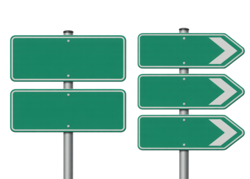 Green directional road signs on metal posts isolated on transparent background