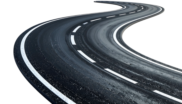 A smooth meandering road with dashed yellow lines, bordered by white edges and a contrasting black surface, evoking motion. Isolated on a transparent background