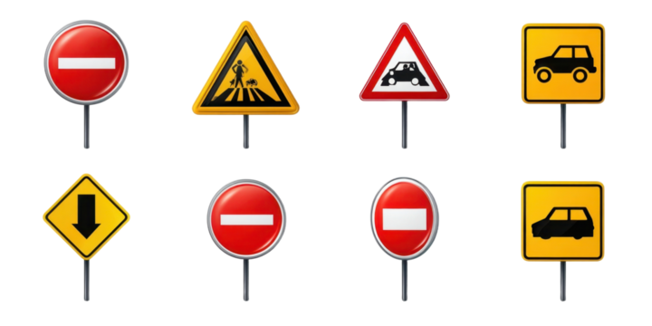 Set of Various Road Signs for Safety and Alertness While Driving Vehicle on Road