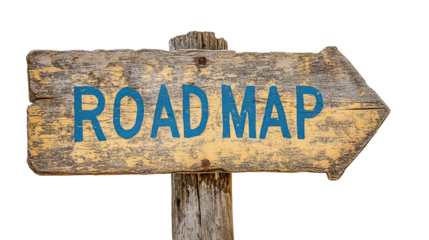 Rustic Wooden Roadmap Signpost on Black Background, Strategic Guidance, Direction