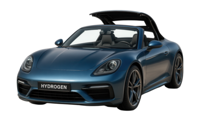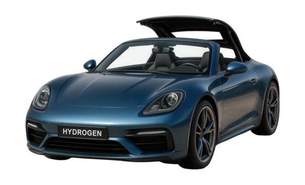 Hydrogen-powered convertible roadster with a retractable roof and dual exhaust.