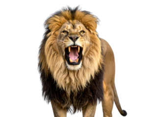 Fierce lion mid-roar with wide-open mouth and visible fangs isolated on a Transparent background, PNG file.