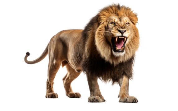 Lion Roaring. A powerful lion is captured in the midst of a roar, its mouth wide open showcasing sharp teeth and a fearsome expression. on a White or Clear Surface PNG Transparent Background.