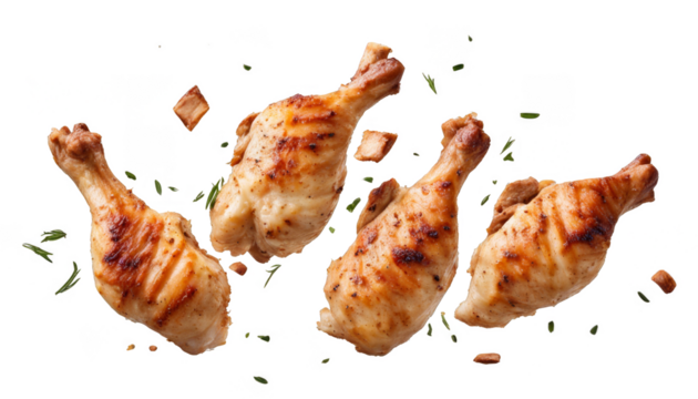 Flying pieces of delicious grilled chicken isolate on transparent background, cutout, png