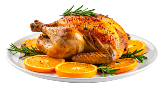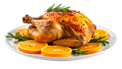 Festive roasted turkey on a platter garnished with oranges, cranberries, and rosemary isolated PNG with Transparent Background