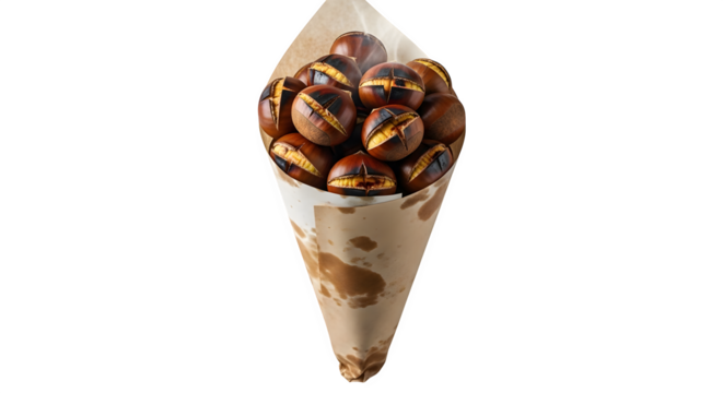 Roasted chestnuts in paper cone isolated on transparent background, a traditional autumn and winter snack, perfect for street food and festive occasions