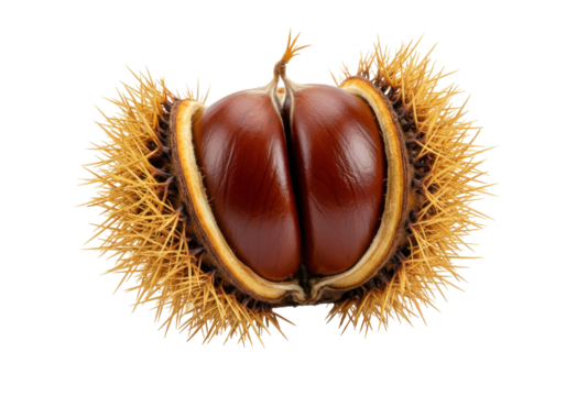 Isolated shiny brown chestnuts within their prickly spiky shell, ready to be roasted