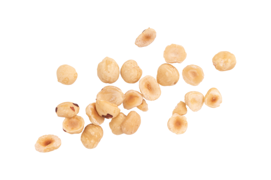 heap of roasted peeled hazelnuts isolated on white background with clipping path, top view, concept of healthy breakfast, vegan food
