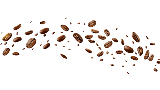 Flying coffee beans in a row with roasted texture and motion effect isolated on white background