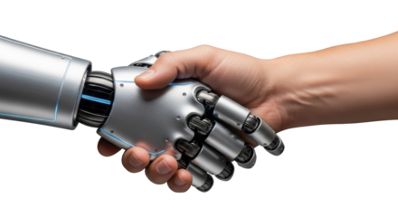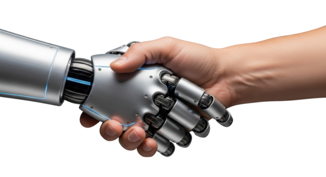 Human and robot handshake concept visualized beautifully showing handshake, robot, human with realistic texture and balanced
