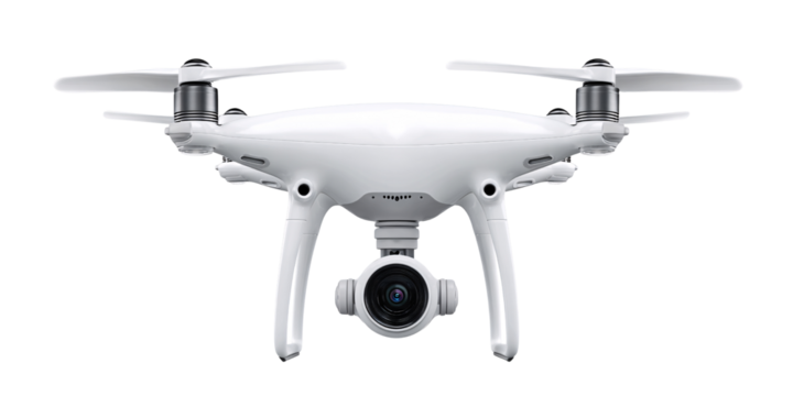 White quadcopter drone with a camera attached, representing modern technology and aerial photography on a transparent background