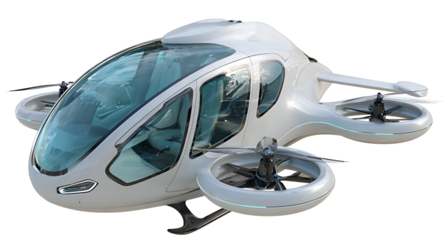 Self-driving delivery drone vehicle, compact design, cargo storage, rotating thrusters, isolated on a white background