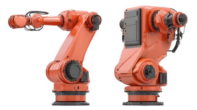 Orange industrial robotic arm with gripper mechanism, cut out, stock png, isolated on transparent background