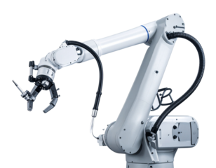 White robotic arm extending its claw against a transparent background, ready for manipulation and automation tasks