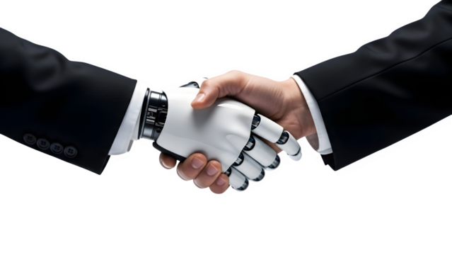Human hand in a business suit shaking a robotic AI hand on white PNG background