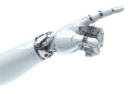 White cyborg robotic hand pointing his finger, trying to reach something. Isolated on Transparent background.