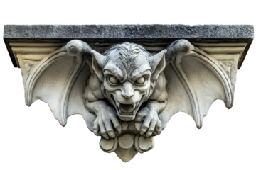 A striking stone gargoyle sculpture with bat-like wings, showcasing detailed craftsmanship and fierce expression.