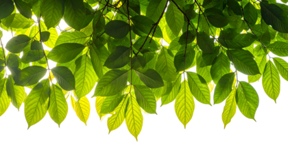 Lush, vibrant green leaves illuminated by sunlight against a black background