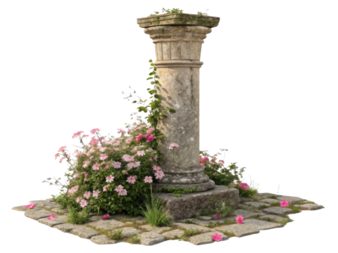 beautiful stone pillar surrounded by vibrant flowers and greenery creates serene garden scene. pillar stands tall amidst colorful blooms