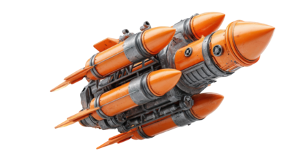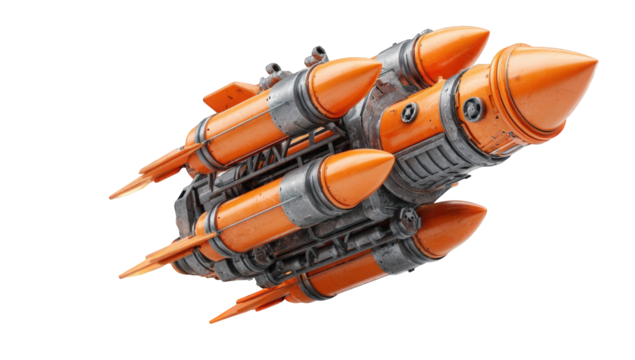 Silver missile with orange fins and fiery exhaust isolated on a transparent background
