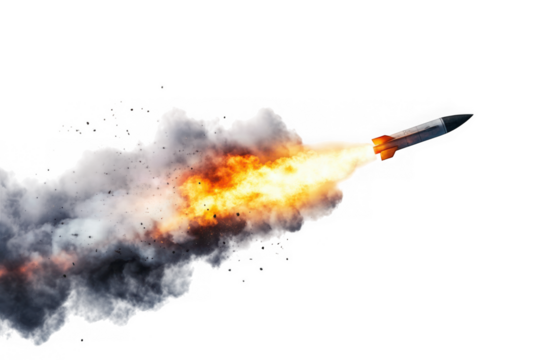Missile launching with fiery exhaust and smoke isolated on transparent background