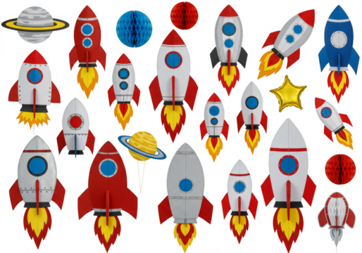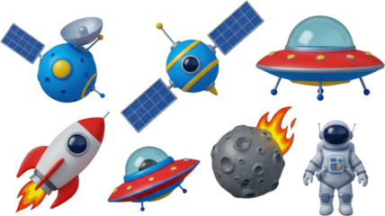 A collection of space objects including rockets satellites UFOs an astronaut and a burning meteor galaxy transparent background