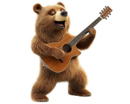 bear playing acoustic guitar with rockstar attitude, showcasing fun and lively expression. This playful scene captures joy of music and performance