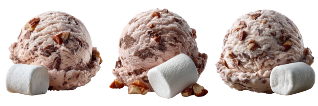 Scoop of rocky road ice cream with a small marshmallow beside isolated on transparent background