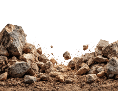 A rocky hillside with large grey stones dry grass and sparse bushes under a white sky isolated on transparent background