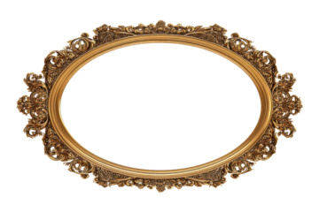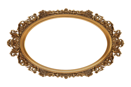 Golden ornate picture frame with intricate carvings and oval shape for decoration isolated on transparent background