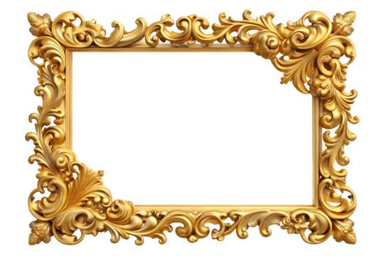 Ornate gold picture frame with baroque rococo details, antique border for elegant design, transparent background