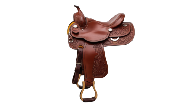 A brown leather saddle is displayed on a white background for equestrian use and activities outdoors.