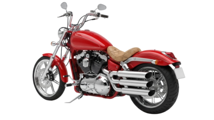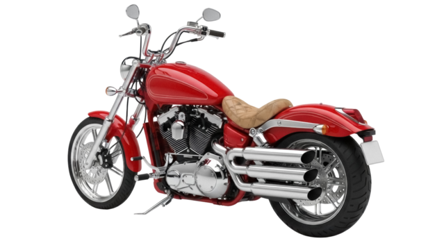 Red custom motorcycle PNG isolated, classic chopper motorbike with chrome exhaust pipes on transparent background, vehicle for transportation