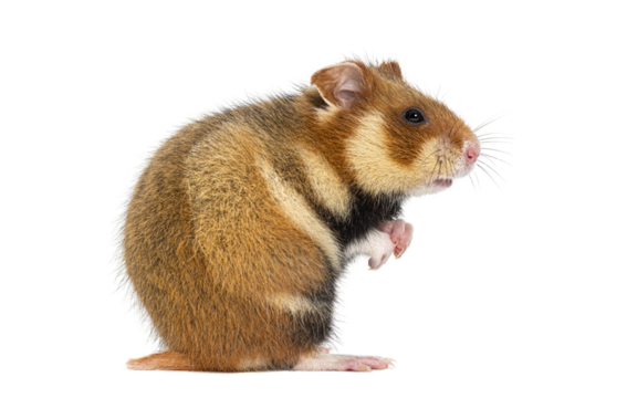 Side view of a European hamster On its hind legs, Cricetus cricetus, isolated on white