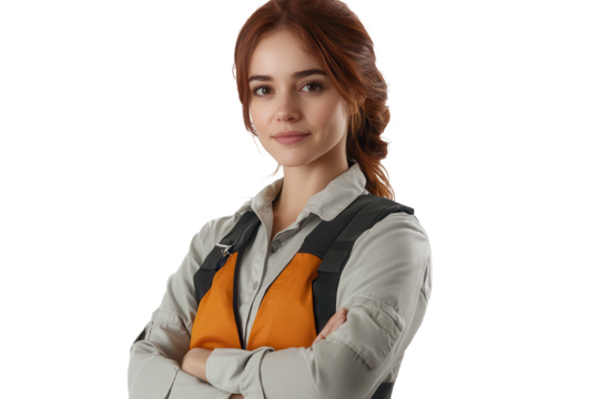confident redhead woman in business outfit with arms crossed isolated on transparent white background