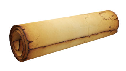 Aged parchment paper scroll with burnt edges isolated on a transparent background
