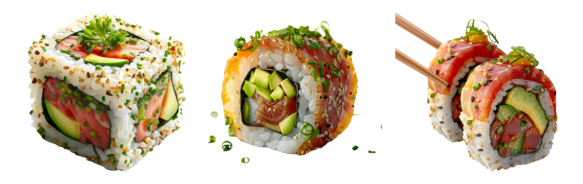 Assorted sushi rolls with chopsticks on plates in various arrangements isolated on transparent background