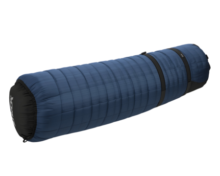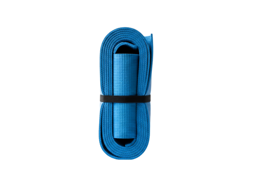 Rolled up blue yoga mat secured with a black band.
