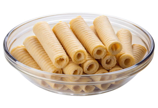Rolled wafer cookies in a glass bowl isolated with transparent background.