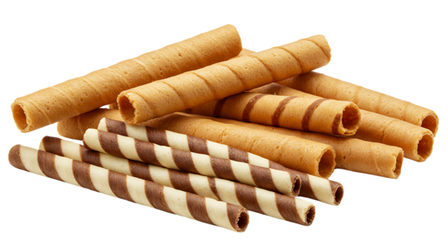 Waffle rolls, striped chocolate and vanilla wafer sticks isolated on transparent background