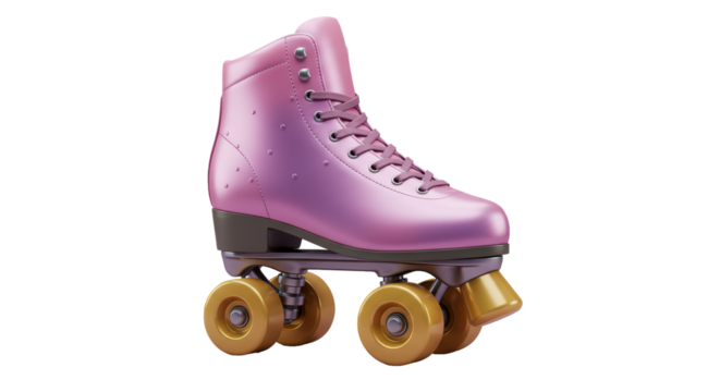 Pair of pink roller skates isolated PNG on transparent background, retro quad skates with beige laces for skating and recreation